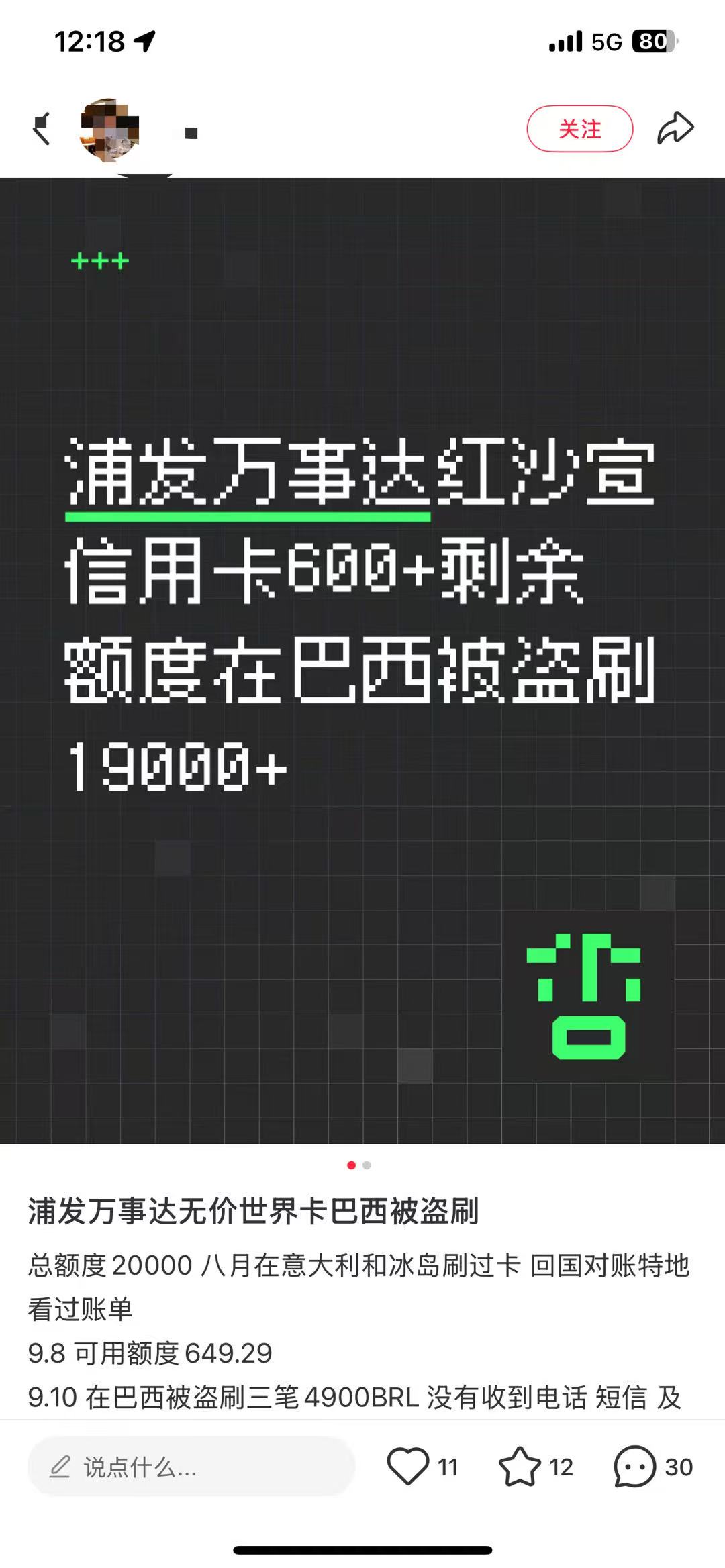 此前,已有多名用户在社交媒体反映了浦发银行万事达信用卡被盗刷现象。其中一名用户表示,自己的浦发万事达无价世界卡在国外发生多笔盗刷,并且未收到短信、电话等提醒。